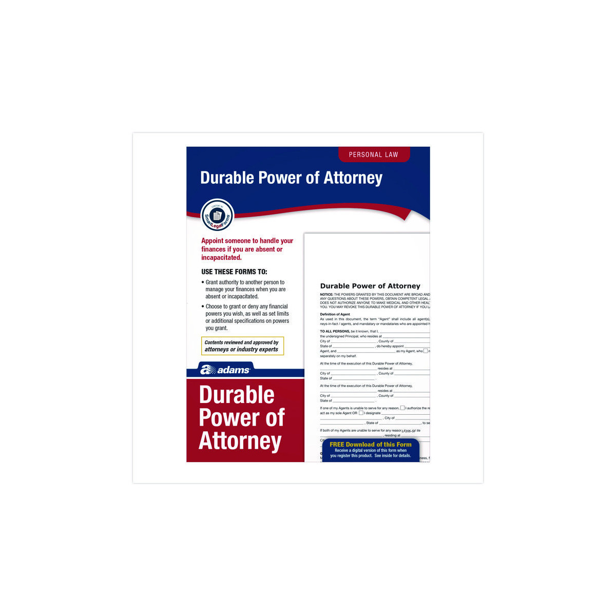 Protect yourself and your loved ones in case of scenarios where you might be incapacitated or absent and appoint someone to handle your finances and legal affairs without legalese or legal fees. Reviewed and approved by attorneys and industry experts, Durable Power of Attorney forms from Adams® Personal Law collection allow you to specify exactly which powers are to be granted and outline any limiting provisions, so you can clearly communicate what your agent or attorney can and can't do. In addition to a hardcopy form sample and easy-to-follow, step-by-step instructions, digital downloads of both the Durable Power of Attorney form and the associated Revocation of Power of Attorney form are included. Simply register the product with Adams® using the included authorization code and receive your downloads. Drafted and developed with Smart Legal Forms™ to be legally valid in all 50 states.
