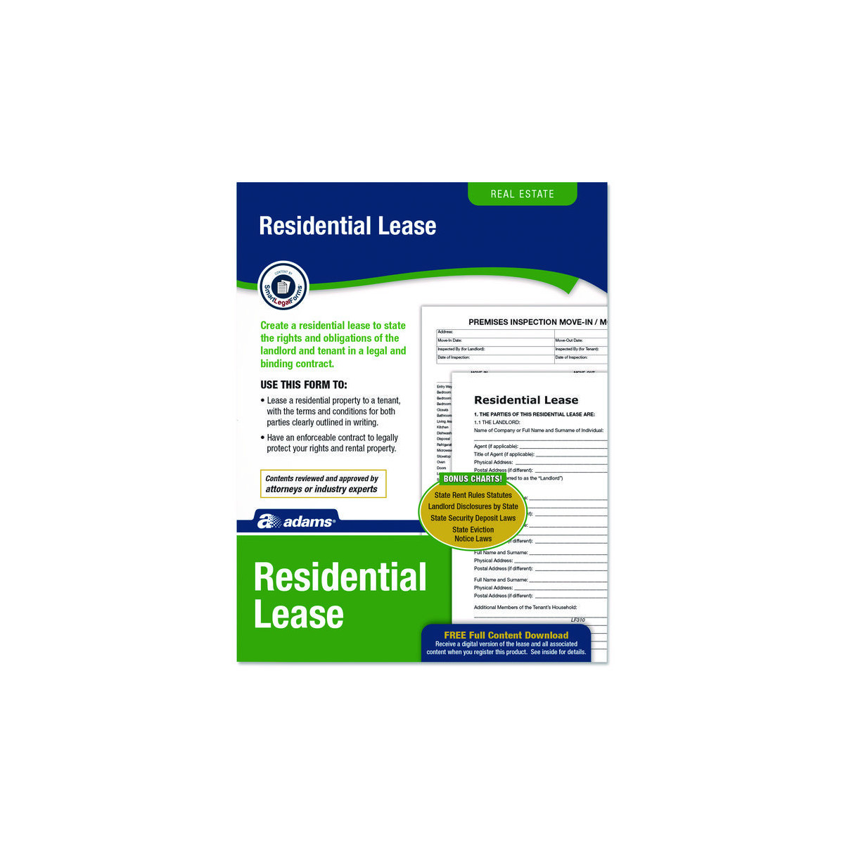Create legally binding leases within your state without legalese or legal fees. Reviewed and approved by attorneys and industry experts, Adams® Residential Lease Form Sets provide everything needed to specify the rights and obligations of the landlord and tenant. In addition to a hard copy of the four-form set, simple, step-by-step instructions and a glossary of all relevant legal terms as well as digital downloads of the residential rental laws in each state and a digital copy of the printable four-form set are also included. Simply register the product with Adams® using the included authorization code and receive your free downloads. Developed with NOLO, the premium provider of DIY legal books and resources.