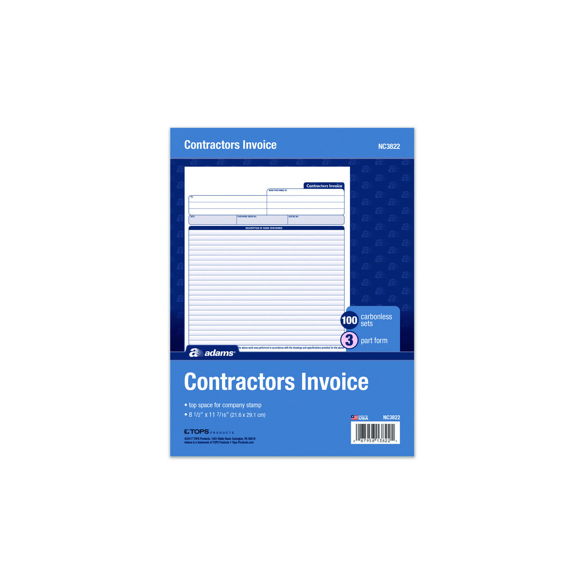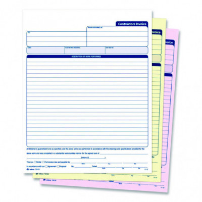 Streamline billing activities with Adams® Multipart Contractor Invoice Forms. Flexible formatting features a large description area to help you leave precise details about each aspect of the job performed. Additional areas accommodate customer information, work location, order number, proposal/bid number, payment instructions and other administrative aspects. Multipart, carbonless design allows you provide a copy to your customer while keeping clean copies for your records. Each form set also features open space at top for your business's logo or name stamp.
