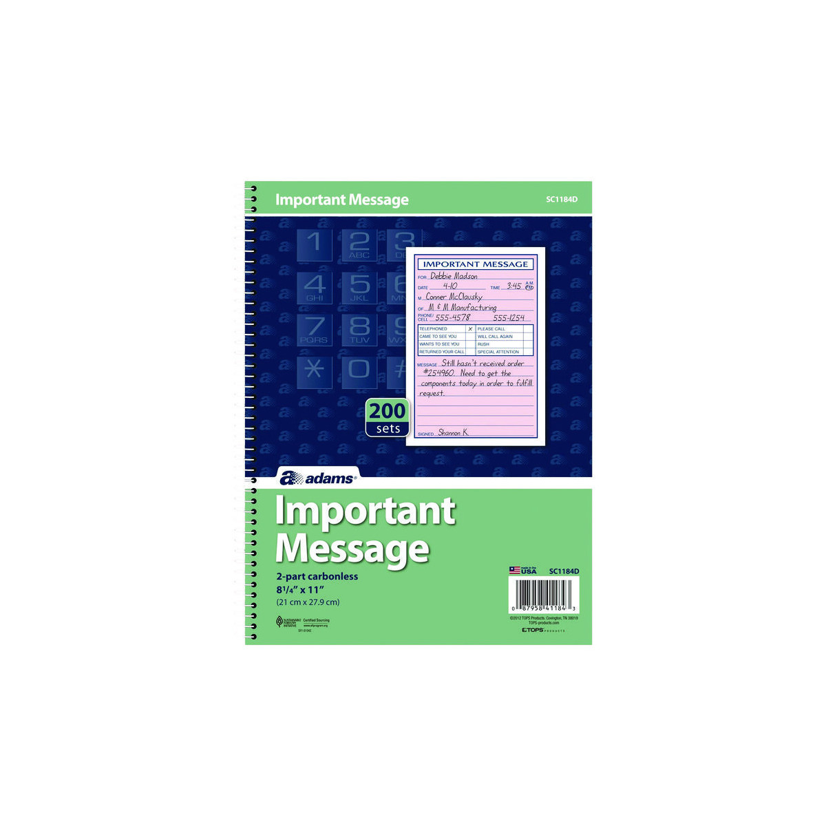 Take note of important messages easily and efficiently with Adams® Important Message Book. Pre-formatted forms provide prompts for all the important details: intended recipient, date, time, comprehensive contact details, means of contact, action-requested, message-taker's name as well as plenty of ruled space for the body of the message. Carbonless, multi-part format allows you to pass along priority messages and keep a copy in the book for administrative tasks. Spiral binding keeps the copies secure while allowing the book to lay flat when open.