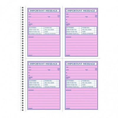 Pre-formatted forms provide prompts for all the important details. Carbonless, multi-part format allows you to pass along priority messages and keep a copy for yourself. Spiralbound.