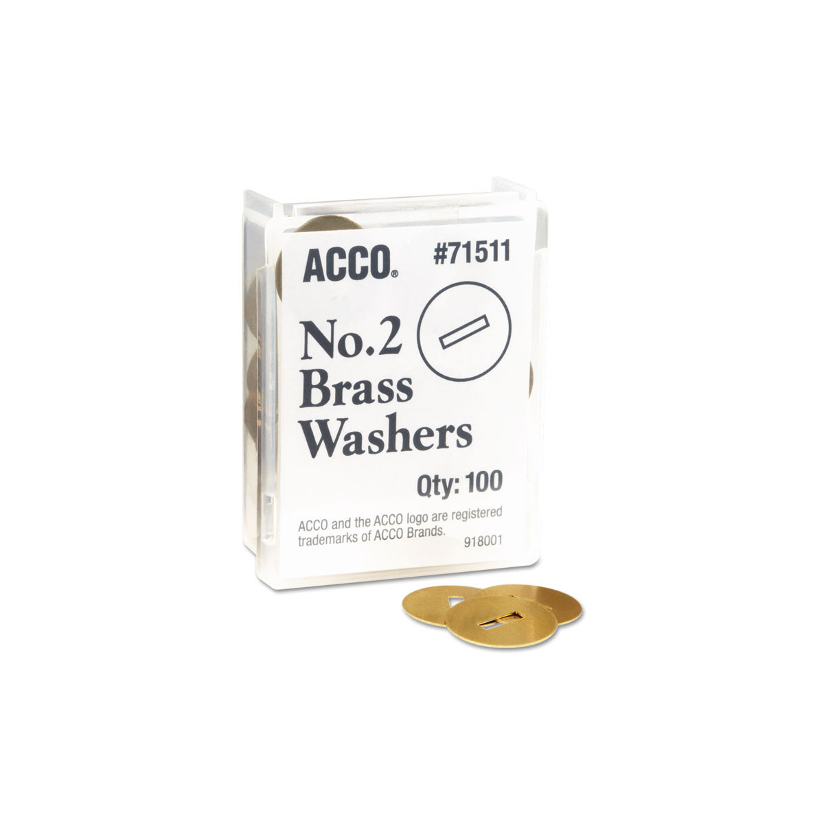 Quality washers designed for use with ACCO® Brass and Brass-Plated Fasteners feature corrosion-free, solid brass construction for maximum durability.