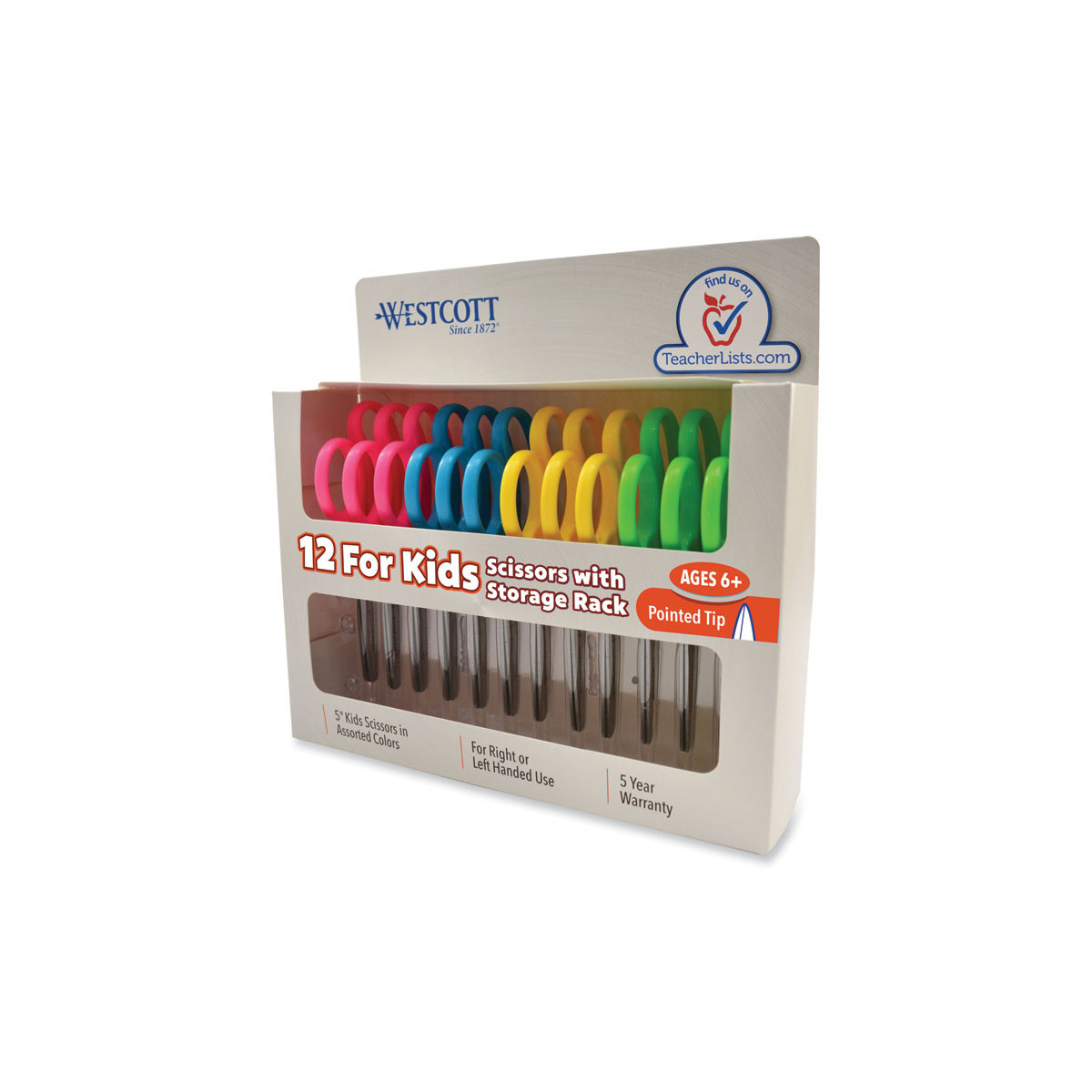 For Kids Scissors Teacher's Pack, Pointed Tip, 5" Long, 1.75" Cut Length, Straight Assorted Color Handles, 12/Pack