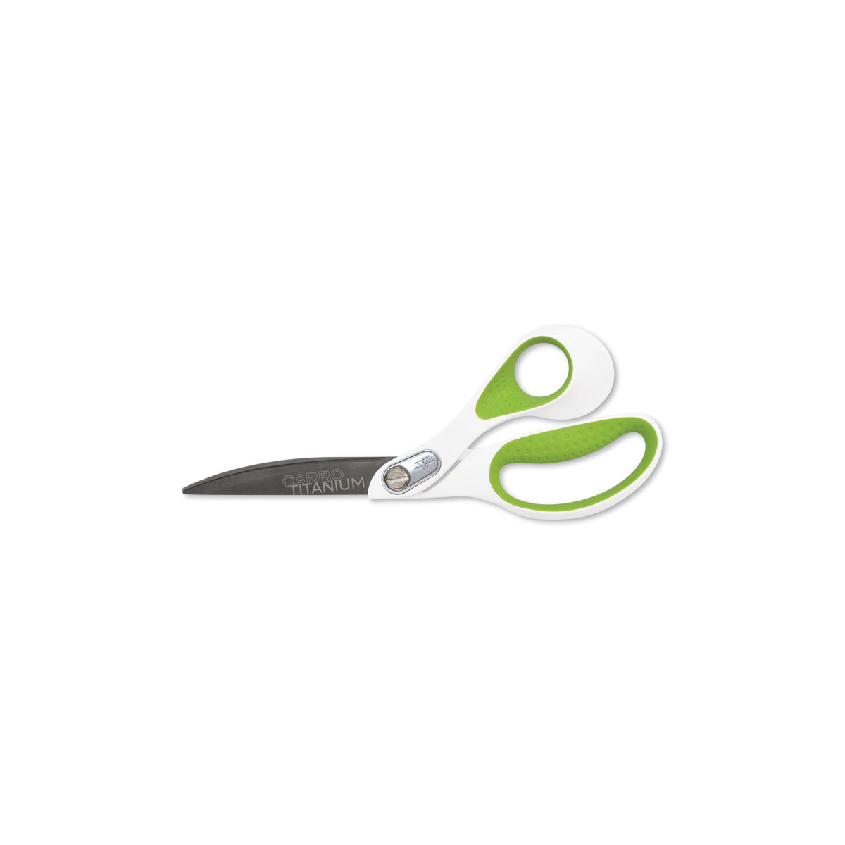 Patent-pending CarboTitanium® blade-bonding technology, one of the hardest titanium-surface treatments available. Industrial-strength blades easily cut through multiple layers of fabric, cardboard, canvas, vinyl magnets and more. Blade surface will not chip, flake or peel. Scissors have a unique ergonomic over mold and high-strength handle.