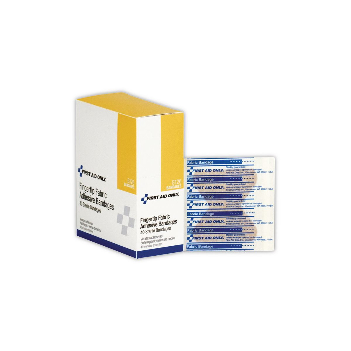 Assortment of bandages for cuts and abrasions in the workplace or home. Packaged for individual use and to replenish first aid stations and kits.