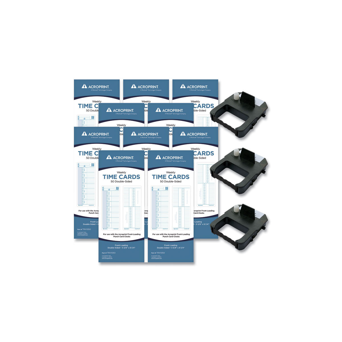Authentic Acroprint high-quality time cards and ribbons designed to work seamlessly with your ES700/ES900 time clock. This time clock accessory bundle includes 500 double-sided time cards and three ink ribbons.