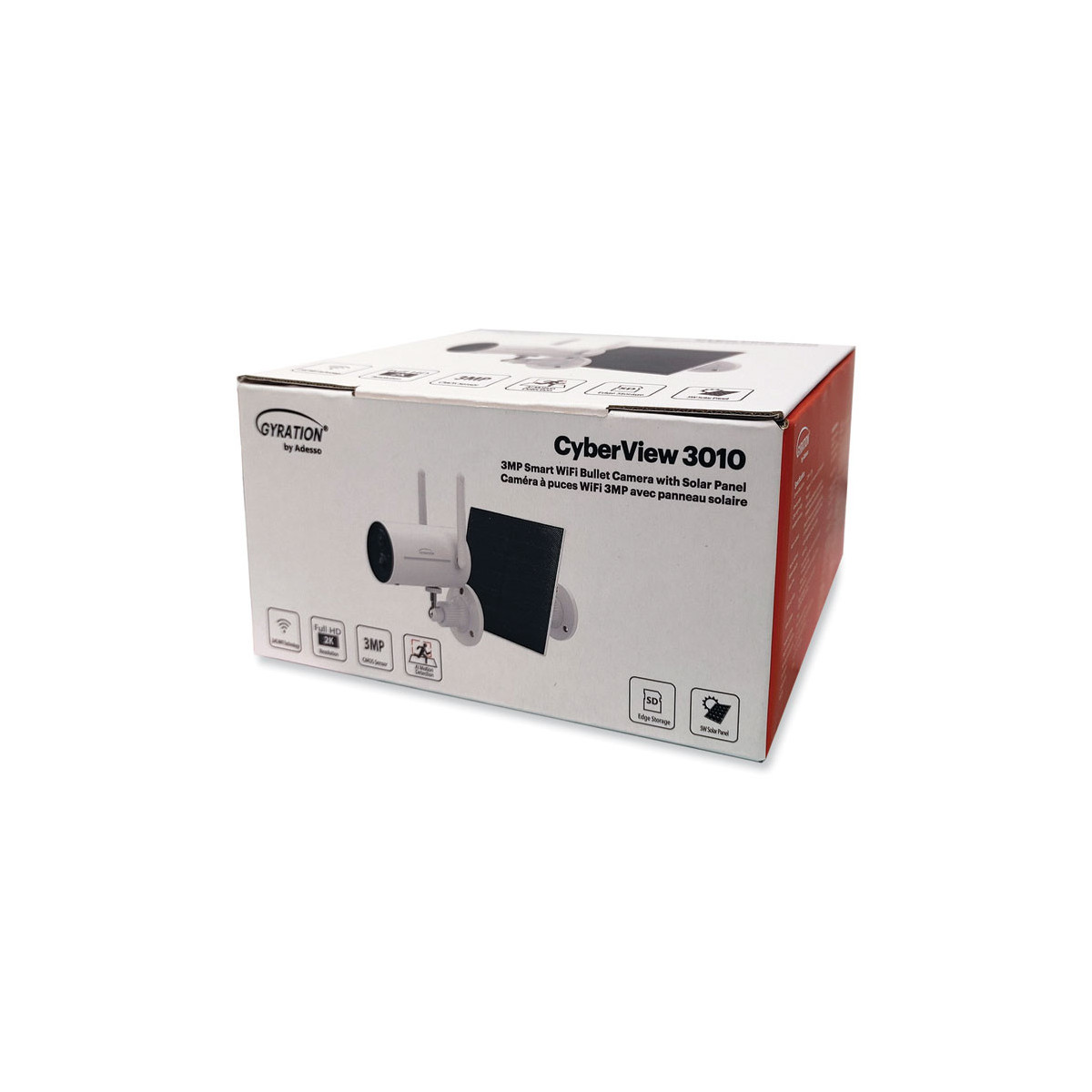 The Gyration Cyberview 3010 is a smart Wi-Fi bullet camera with a solar panel that captures high-quality 3 MP images with its 1/2.8" CMOS sensor. It supports a 2304 x 1296@15 fps resolution in a 16:9 aspect ratio and includes 3x digital zoom for closer viewing. The camera features intelligent transmission, giving full play to the capabilities of the network. It is solar power supported with a built-in rechargeable battery, making it an energy-efficient option for home security. The camera supports Wi-Fi connection and easy installation, and includes a built-in mic and speaker, allowing for two-way audio. With multiple storage options, including Cloud storage, Micro SD card storage up to 128 GB, and mobile phone video recording, you can easily save and review footage. The IP65 rating ensures the camera is protected from dust and water, making it suitable for outdoor use. Overall, the Gyration Cyberview 3010 is a reliable and efficient option for your home security needs.
