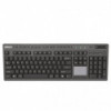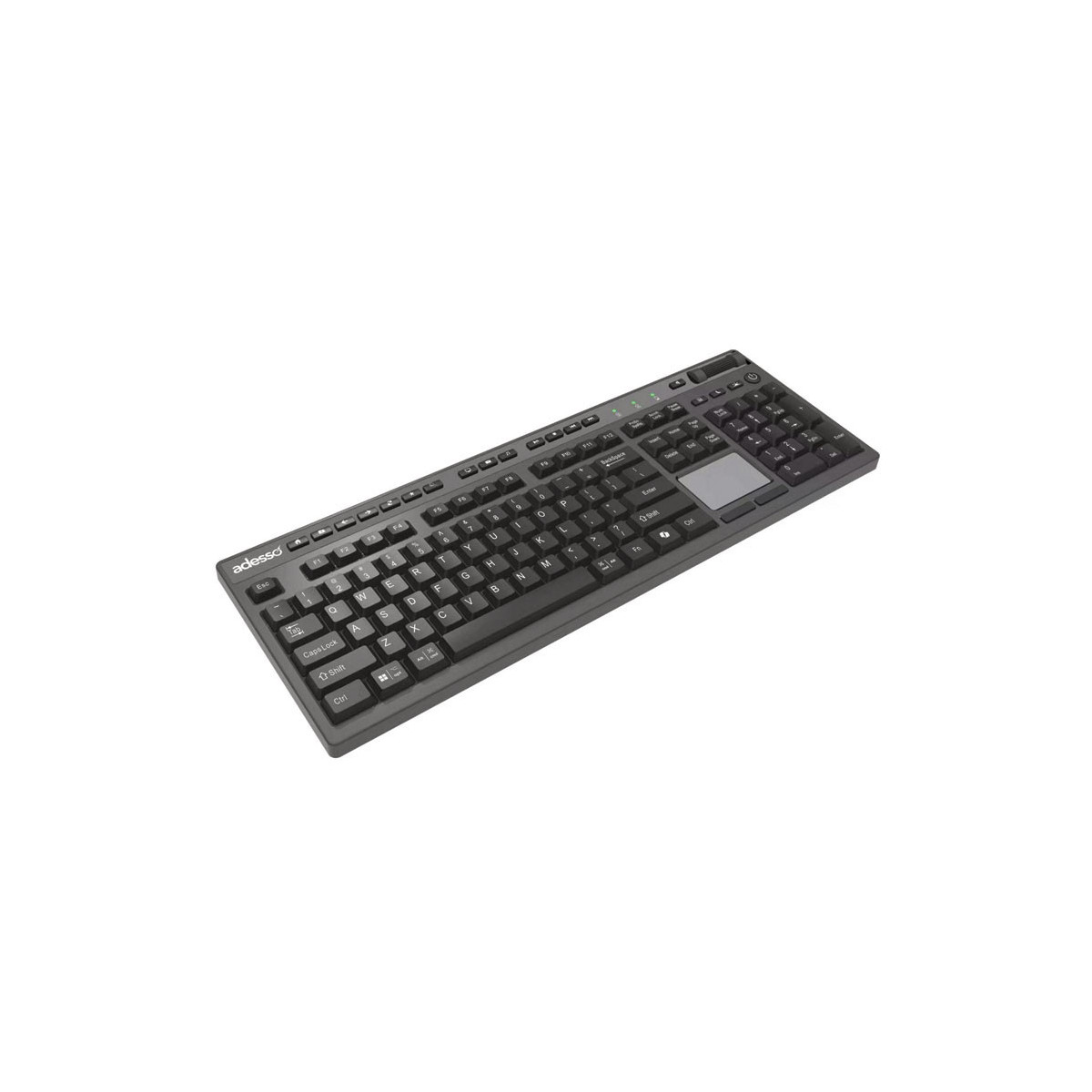 The Adesso WKB-4450UB multi OS wireless desktop touchpad keyboard lets you work without the limitations of cables, wires or line-of-sight receivers. This wireless keyboard is an all-in-one solution providing a full 104-key QWERTY keyboard layout, built-in touchpad, and multimedia and Internet hotkeys. In addition to your touchpad this keyboard also features a scroll pad and left and right mouse buttons so navigating documents and web pages is a breeze, without ever using a mouse! Now you can control every aspect of your PC from one convenient location. With its clean lines, elegant chrome accents, and piano finish design the keyboard adds style to any room at home or at the office. This touchpad keyboard offers the freedom to use your keyboard on most devices such as PCs, Notebooks, iPad, iMac and smartphones that support USB connection. No matter what you are doing on the computer, you can now enjoy working at any angle and at a distance of up to 30 feet and have minimal interruptions with 65,000 auto switching IDs over 12 channels. The keyboard also features an integrated built-in touchpad which can take the place of your mouse, making it easier to control the movement of the cursor in your personal computer. Control all aspects of your user experience with one-touch using the built-in Internet, multimedia, and desktop Hotkeys. Quickly complete your tasks with 13 Windows keys that let you quickly navigate your files and the web while taking full control of your multimedia entertainment with seven multimedia hotkeys.