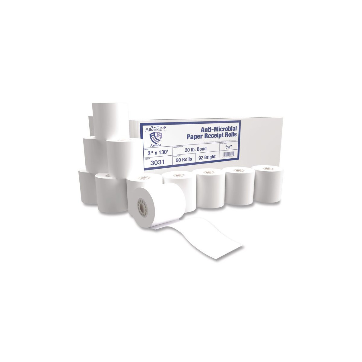 Armor Antimicrobial Receipt Roll Paper, 3" x 130 ft, White, 50/Carton