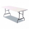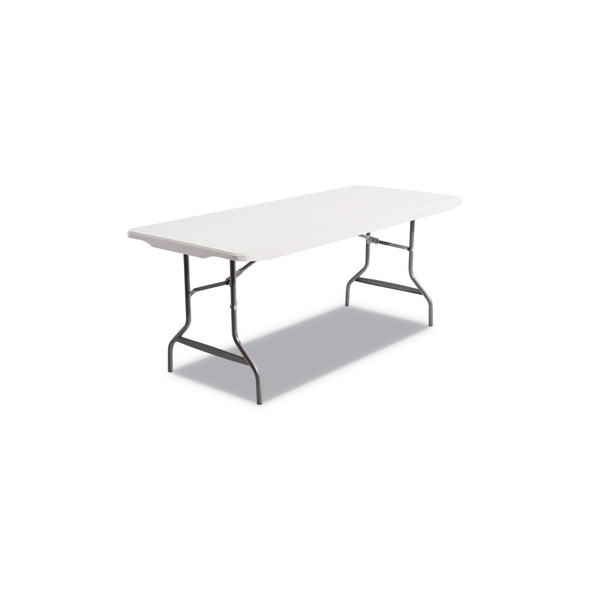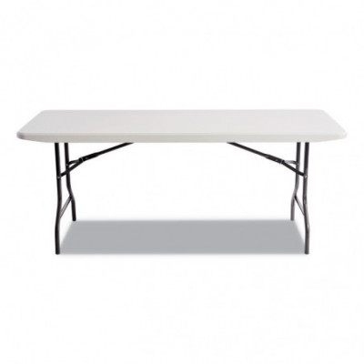 Tables for indoor and outdoor usage. Blow-molded, high-density polyethylene top is dent, scratch, stain and water resistant. Legs fold into underside cavity. Folds to 2" for storage. Charcoal gray powder coated 1" steel tub legs with non-marring feet.