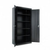 Assembled storage cabinet with three-point locking bar system locks top, bottom, and doors. Durable, reinforced doors with satin chrome double handles open 180° for easy access to contents. Industrial-grade steel with powder coat finish for long lasting use. The sturdy, 16-gauge door frame prevents racking. Heavy duty secure knuckle hinges for longevity. Built-in leveling glides help compensate for uneven floors.
