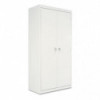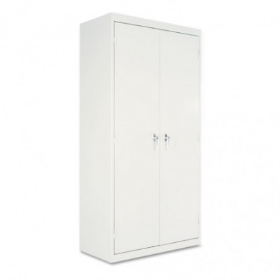 Assembled storage cabinet with three-point locking bar system locks top, bottom, and doors. Durable, reinforced doors with satin chrome double handles open 180° for easy access to contents. Industrial-grade steel with powder coat finish for long lasting use. The sturdy, 16-gauge door frame prevents racking. Heavy duty secure knuckle hinges for longevity. Built-in leveling glides help compensate for uneven floors.