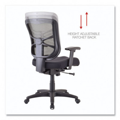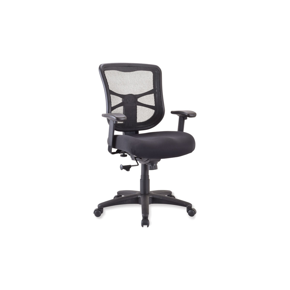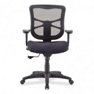This chair offers an ergonomic design that adjusts to fit multiple users. Its cool and breathable mesh back and contoured waterfall seat cushion helps relieve pressure on the legs. Adjustable lumbar support and a height-adjustable ratchet back deliver personalized spinal alignment. Five-star base with casters allows for easy mobility.