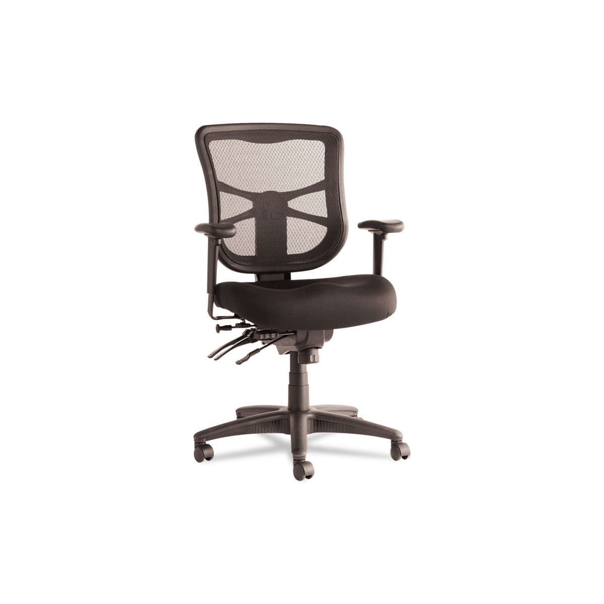 Multifunction mechanism with seat glide allows back angle adjustment relative to seat, adjustable tilt (free floating or infinite locking positions) and forward tilt. Cool, breathable mesh back. Contoured seat cushion with waterfall edge to help relieve pressure on legs. Height- and width-adjustable arms with soft polyurethane pads. Five-star base with casters for easy mobility.