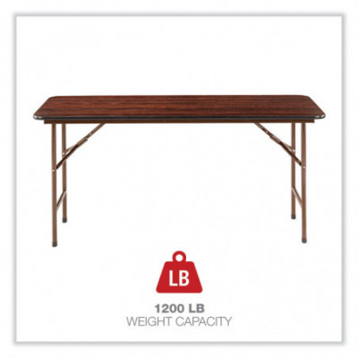 Folding table with scratch-resistant melamine top that is 0.63" thick with a one-piece, 1.75" steel apron and protective edging. Fully finished laminate on top and underside to prevent warping. Laminate is scratch, dent, and water-resistant for long-lasting use. The gravity leg-locking mechanism makes set-up quick and easy. Folds to 2.5" thick and locks for easy transport and storage. 1" diameter, steel legs have plastic foot caps to protect floors. Holds up to 1,200 lbs of evenly distributed weight.