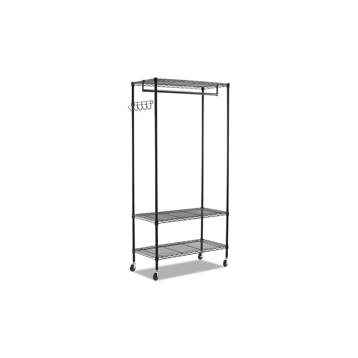Time-saving design assembles in minutes without tools. Strong welded wire construction that allows air circulation and helps reduce dust buildup. Double-sided for quick access to items. Rack features hanging rod for garments, five support hooks for umbrellas, bags, and other items to accommodate your needs. Three shelves adjust in 1" increments and support 350 lbs. on each shelf. Four casters for quick mobility and two lock when it has reached your destination. Total unit capacity is 500 lbs. if used with casters. Hangers not included.