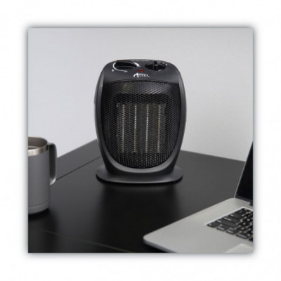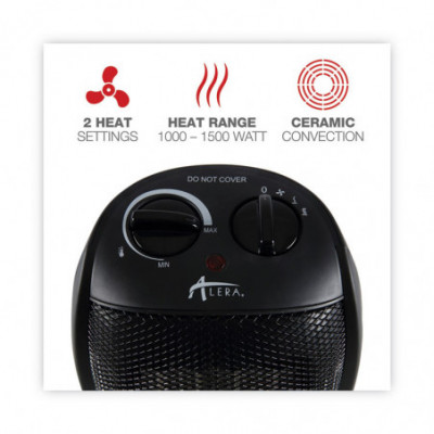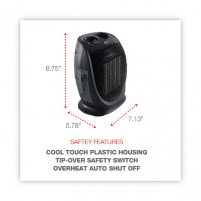 The lightweight table-top heater is ideal for easy portability. Air is heated by an efficient ceramic heating element and then circulated around the room by a fan. Adjustable thermostat up to 1500-watt heating output. Designed with safety in mind with overheat auto-shut off protection, tip-over safety switch, and a cool-to-the-touch plastic housing. Quiet heat or fan-only setting for all-season use.