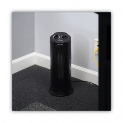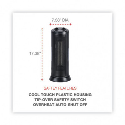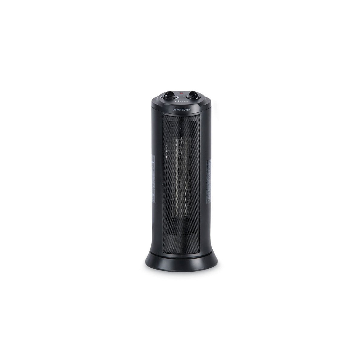 The oscillating mini tower heater delivers heat where you need it. Air is warmed as it passes over a large ceramic and aluminum heating element, and heat is dispersed by a powerful fan. Adjustable thermostat up to 1500-watt heating output for maximum comfort. Designed with safety in mind with overheat auto-shut off protection, tip-over safety switch, and a cool-to-the-touch plastic housing.