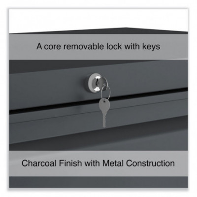 Drawers with side-to-side hang rails to accommodate letter/legal hanging files. Full drawer extension on steel ball bearing telescoping slide suspension helps drawers glide with ease. Stylish, full-width radius edge recessed pulls help to quickly open and close drawers. Anti-tipping interlock system allows only one drawer to open at a time. Single key core removable lock with two keys. Four adjustable leveling glides. Durable powder coated finish helps prevent scratches.
