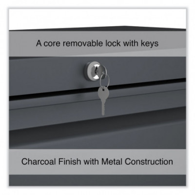 Drawers with side-to-side hang rails to accommodate letter/legal hanging files. Full drawer extension on steel ball bearing telescoping slide suspension helps drawers glide with ease. Stylish, full-width radius edge recessed pulls help to quickly open and close drawers. Anti-tipping interlock system allows only one drawer to open at a time. Single key core removable lock with two keys. Four adjustable leveling glides. Durable powder coated finish helps prevent scratches.