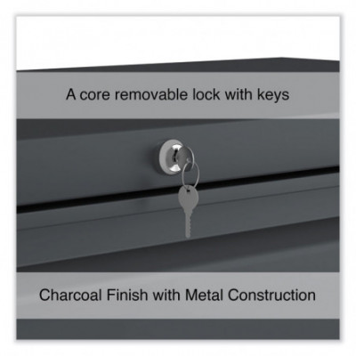 Drawers with side-to-side hang rails to accommodate letter/legal hanging files. Full drawer extension on steel ball bearing telescoping slide suspension helps drawers glide with ease. Stylish, full-width radius edge recessed pulls help to quickly open and close drawers. Anti-tipping interlock system allows only one drawer to open at a time. Single key core removable lock with two keys. Four adjustable leveling glides. Durable powder coated finish helps prevent scratches.