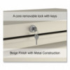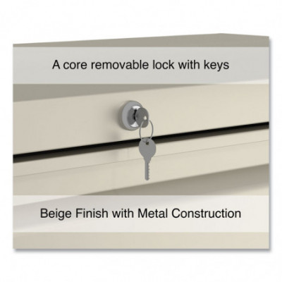 Drawers with side-to-side hang rails to accommodate letter/legal hanging files. Full drawer extension on steel ball bearing telescoping slide suspension helps drawers glide with ease. Stylish, full-width radius edge recessed pulls help to quickly open and close drawers. Anti-tipping interlock system allows only one drawer to open at a time. Single key core removable lock with two keys. Four adjustable leveling glides. Durable powder coated finish helps prevent scratches.
