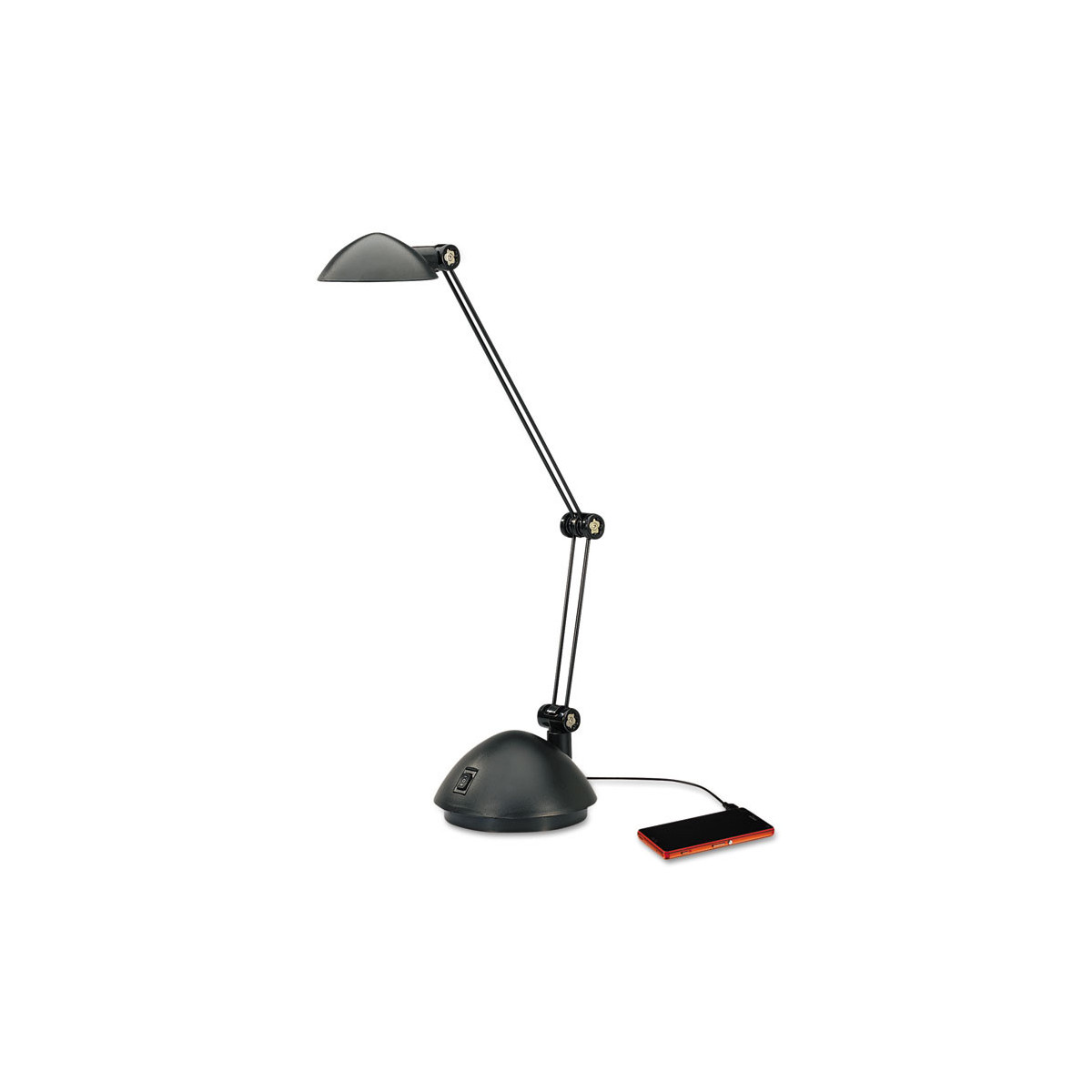 An ideal option for all task lighting needs with the lasting power of LED. Three-point adjustable twin arm for maximum reach. USB charging port hidden on base for conveniently charging smart phones, tablets and other devices. Built-in diffuser distributes light evenly and helps eliminate glare. 3 watt surface-mount LEDs have an average rated life of 20,000 hours. On/off switch conveniently located on base. Dome style base measures 5 1/4" in diameter.