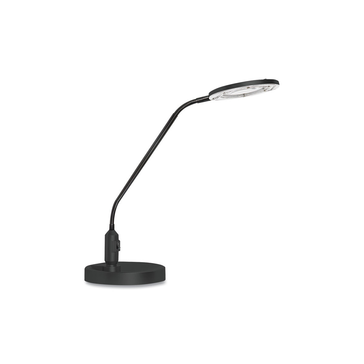 The 3-diopter acrylic magnifier lens enlarges 1.75 times. Magnifier lens includes built-in high power 5-diopter mini lens for additional magnification to see small details and fine print with greater comfort and ease. Versatile design includes interchangeable desk base and mounting clamp. Metal arm features gooseneck joints at base and shade for maximum flexibility in positioning. On/off switch conveniently located on base of arm. The 6.75" round desk base features recessed design for holding clips, coins and other sundries. Surface-mount, 5.4 watt LEDs have an average rated life of 20,000 hours. Flip up lens cover protects magnifier lens from dust and scratches when not in use. AC adapter includes 70" long cord.