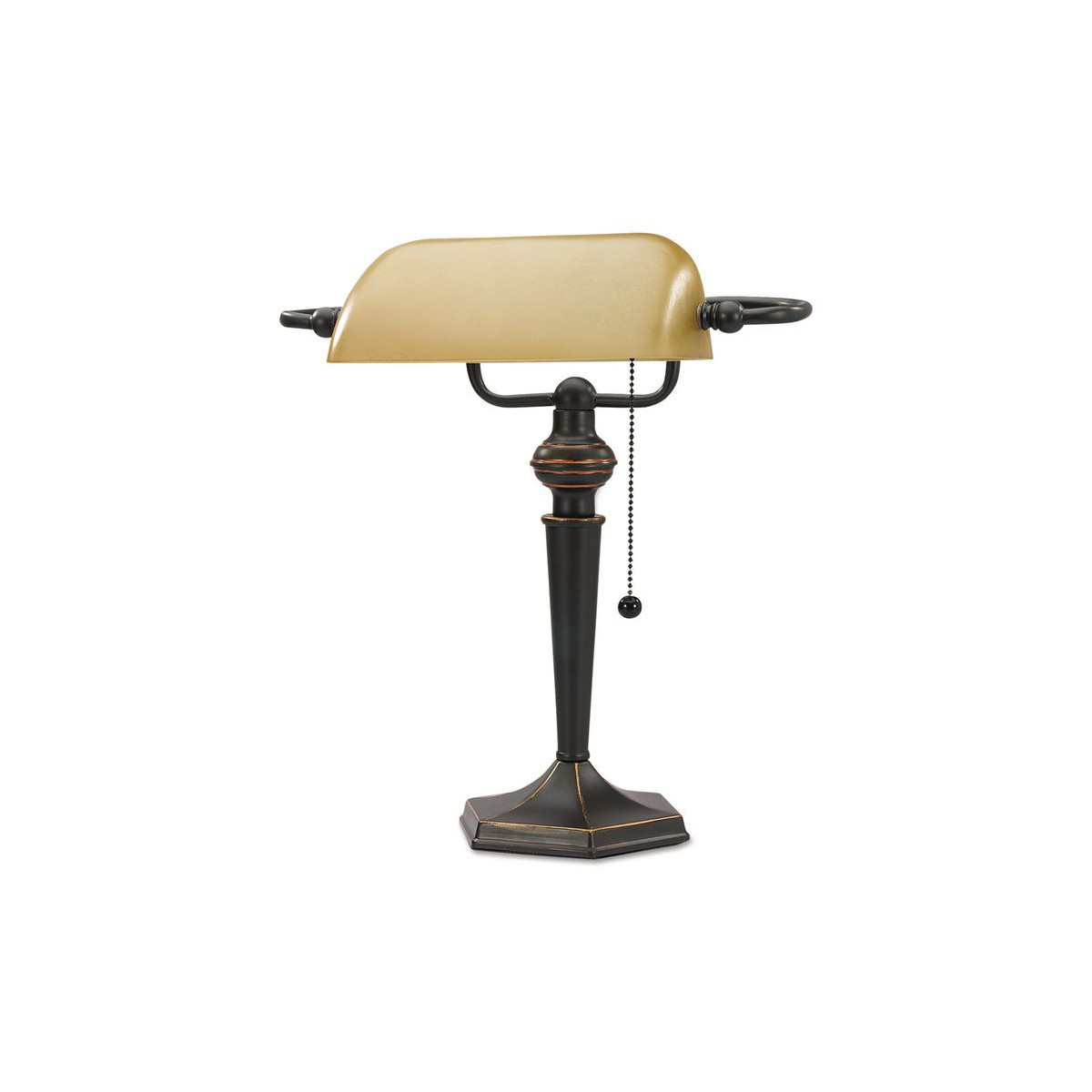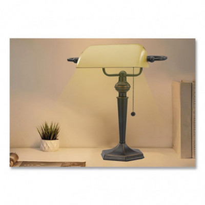 Classic design adds sophistication and elegance to any office, study, or home den. Refined glass shade rotates to pilot light direction. Classic pull chain for easy on/off power. 13W CFL bulb is included.