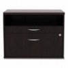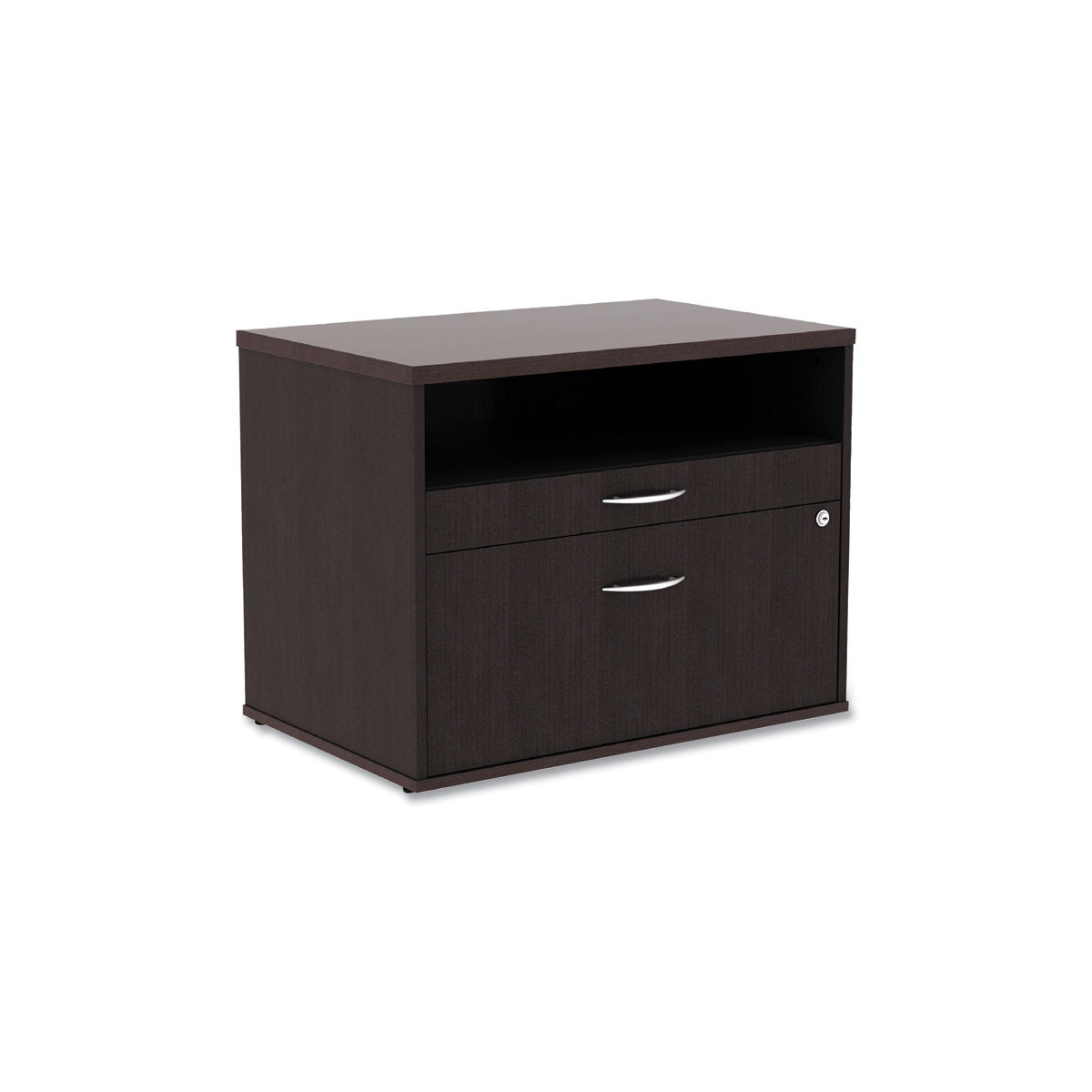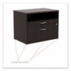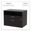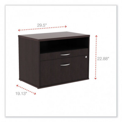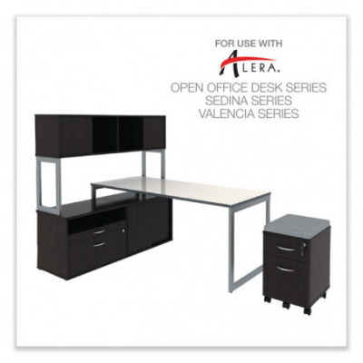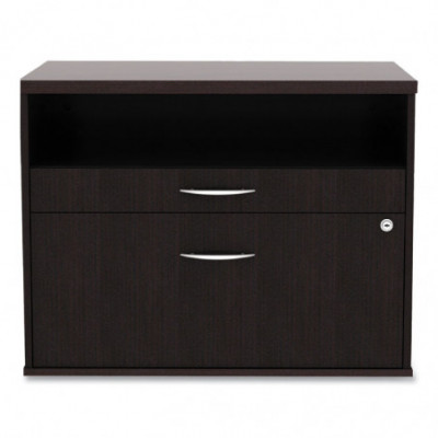 Sturdy file cabinet holds letter or legal files and is great for storage or as a low credenza with your desk. Can be used as a return to expand your desk space to create "L" or "U" shaped desk configurations. Coordinating laminates for use with Alera® Valencia, Sedina, or Open Office Desk Series. Three storage spaces including lateral file drawer, pencil drawer, and open storage. Full extension, ball-bearing slides for easy access to everything. Configurable left or right-handed. Durable woodgrain laminate is scratch, dent, and water-resistant. Leveling glides compensate for uneven floors. Two, fold-away safety keys.