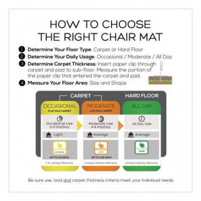 Thinner mat provides a great value while offering economical performance. Lightweight chair mat for occasional use on carpets up to 1/4" thick. Easy-glide rolling surface provides effortless chair movement. Studded design secures mat from moving while protecting carpet from caster wear, spills and heavy traffic. Free and Clear® non-orthophthalate, non-cadmium formula promotes a healthy work environment while offering exceptional clarity and durability. Classic straight edge finish.