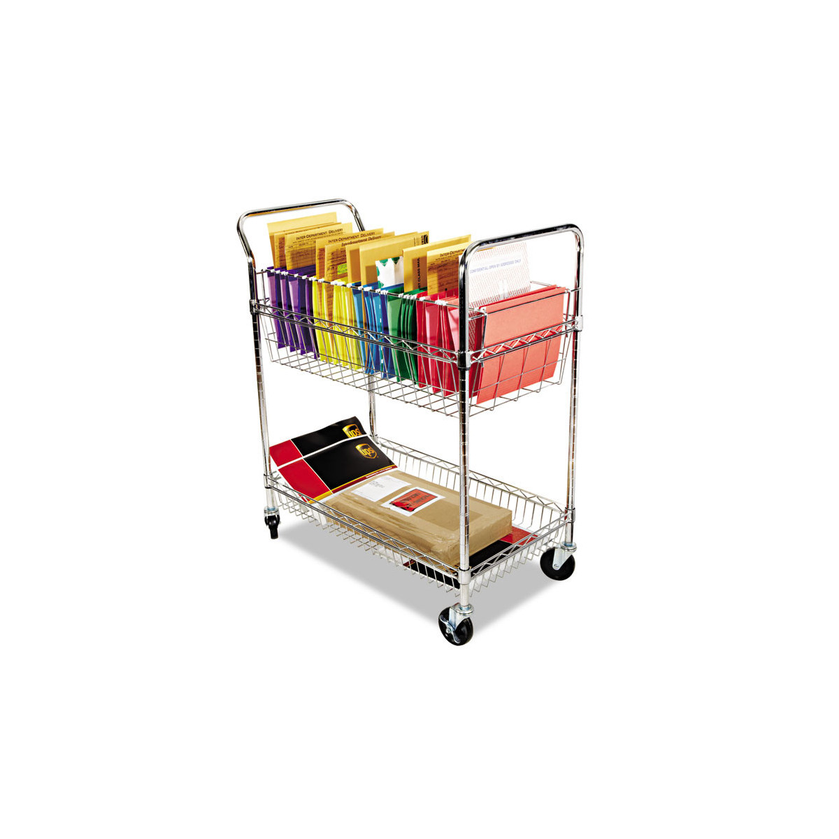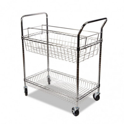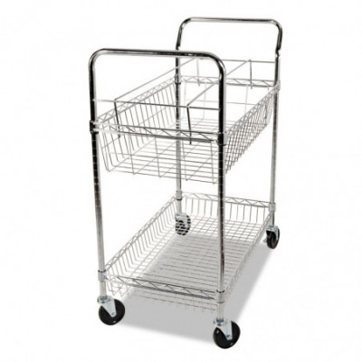 Ideal mobile carry-all cart. Use to haul mail, packages, boxes, books or files around the office. Top basket can accommodate letter- or legal-size files with included adjustable file rods. 7" deep top basket. Sturdy bottom basket with 4" raised sides to prevent larger items from sliding off during transport. Heavy-duty metal tube and wire construction resists scratches and withstands constant use. Commercial grade 4" casters with two locking. Snaps together in minutes without tools. Shelf and basket height adjustable in 1" increments.