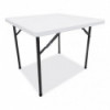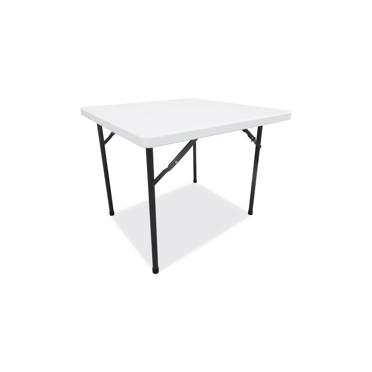 Versatile folding table is perfect for indoors or outdoors. Convenient square, folding table sets up quickly when you need an extra table and space is limited. Blow-molded polyethylene top is water and stain resistant to ensure it won't crack or stain. Strong, durable, powder-coated metal construction withstands dents and scratches. Slide lock feature enhances table stability once opened. Legs fold flush into table creating a flat surface for easy storage and stacking. Non-marring foot caps prevent floor damage. Supports up to 600 lbs of evenly distributed weight.