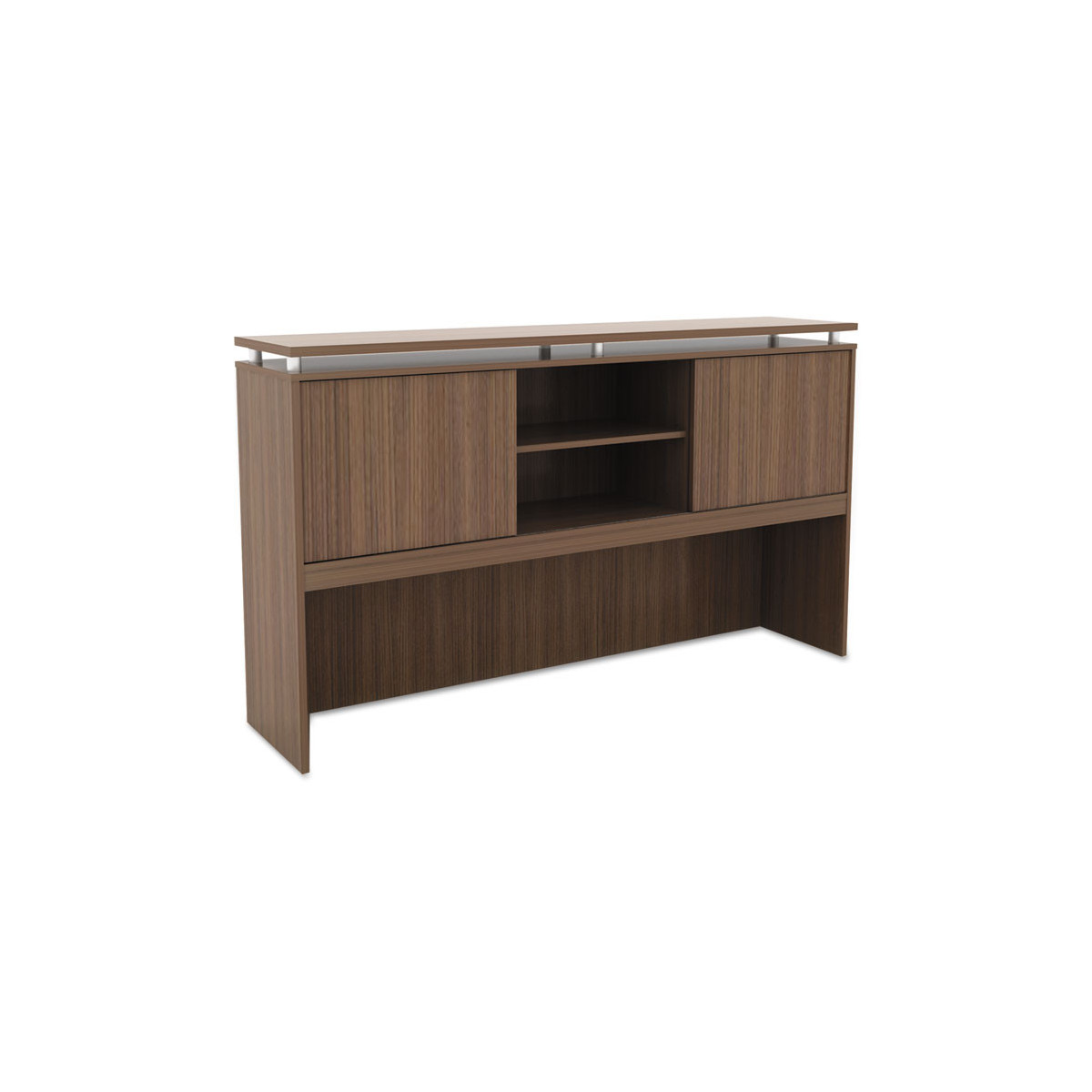 A contemporary classic with clean lines, elevated top and modern silver metalwork. Thermally fused woodgrain laminate is scratch-, dent- and water-resistant. Compartmentalized storage with adjustable shelves and two sliding doors. 20 1/2" clearance accommodates most monitors for space efficiency. Light valance and four grommets for easy cable management or task light installation. Optional tackboard helps keep you organized.