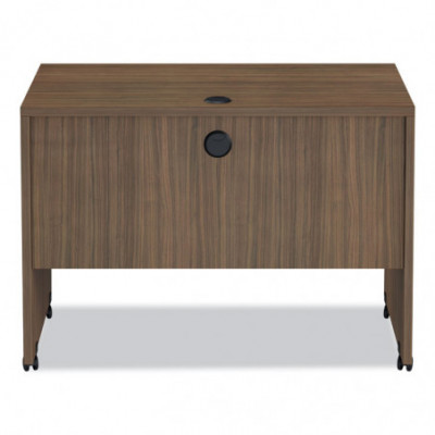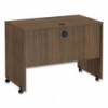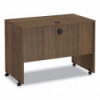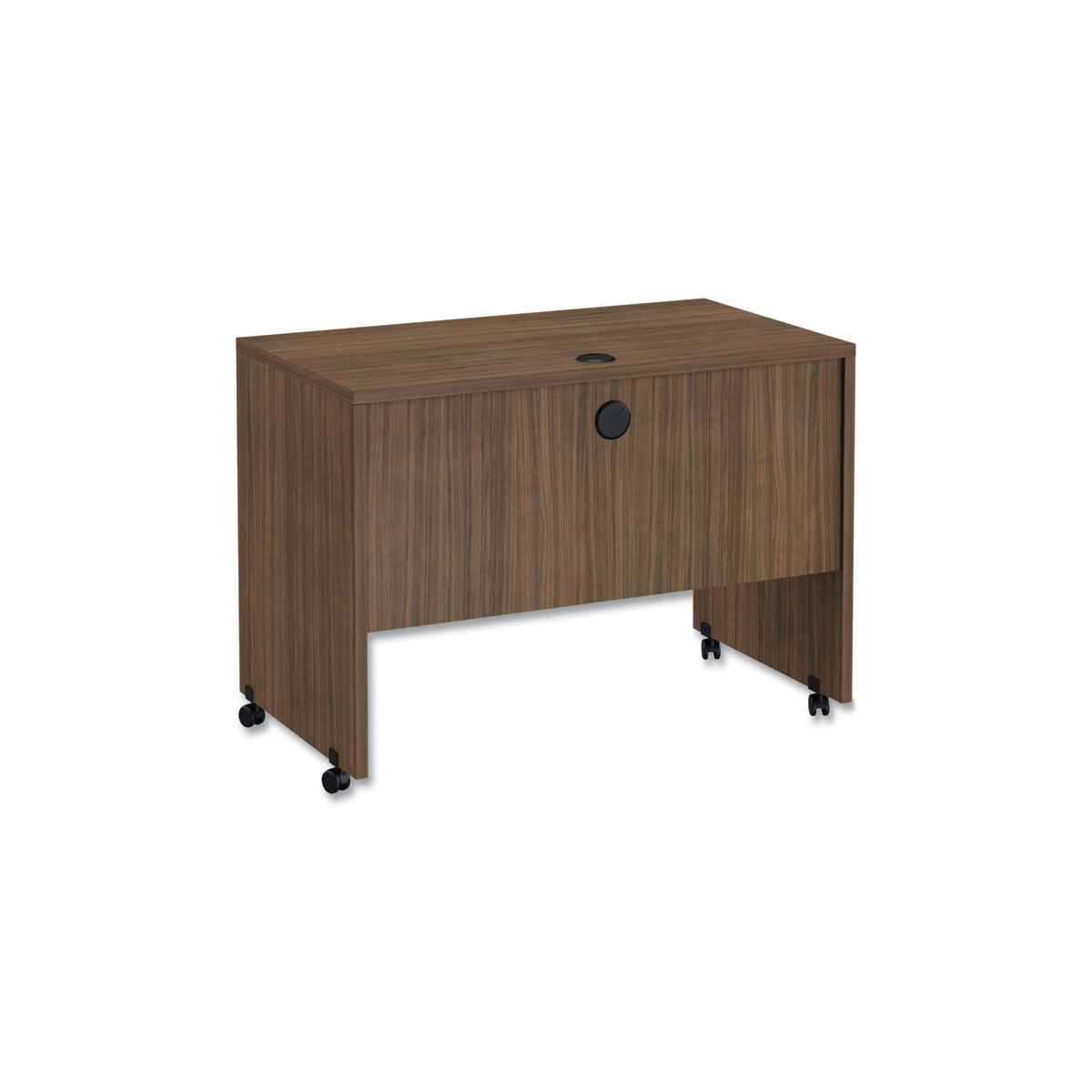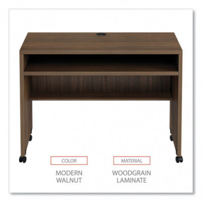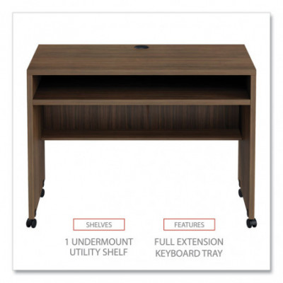 Portable mobile workstation desk goes anywhere you need it. Scaled to fit in tight spaces and designed to pass through standard doorways to go from room to room. Full width, full-extension, slide-out keyboard tray. Commercial-grade laminate worksurface and side panels are water-, scratch-, and dent-resistant. Protective edge banding helps prevent damage from bumps. Two grommets for cable and wire management. Undermount interior shelf for quick storage and to hold wires when moving. Three-fourths height back modesty panel for privacy. Four casters (two locking) for mobility.