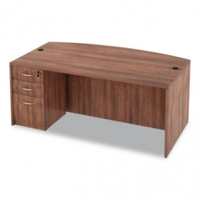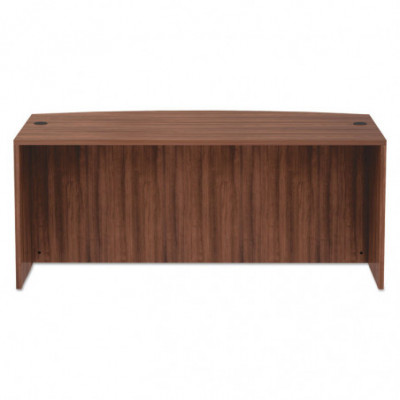 Commercial grade laminate work surface and side panels are water-, scratch- and stain-resistant. Charcoal accent line under worksurface adds a distinctive touch. Arched front with up to 18'' of conference overhang. Protective edge banding helps prevent damage from bumps. Two grommets for cable and wire management. Full-length modesty panel for privacy.