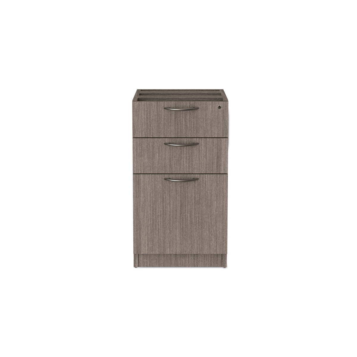This pedestal file attaches neatly under your worksurface, saving floor space. Its sturdy four-sided drawer construction with separate front panels delivers reliable durability, while full-extension ball-bearing slides enable effortless access to file drawers. Each drawer locks securely and is edged with 3 mm durable banding to resist bumps and dings. The included fold-away safety keys maintain a slim profile when not in use.