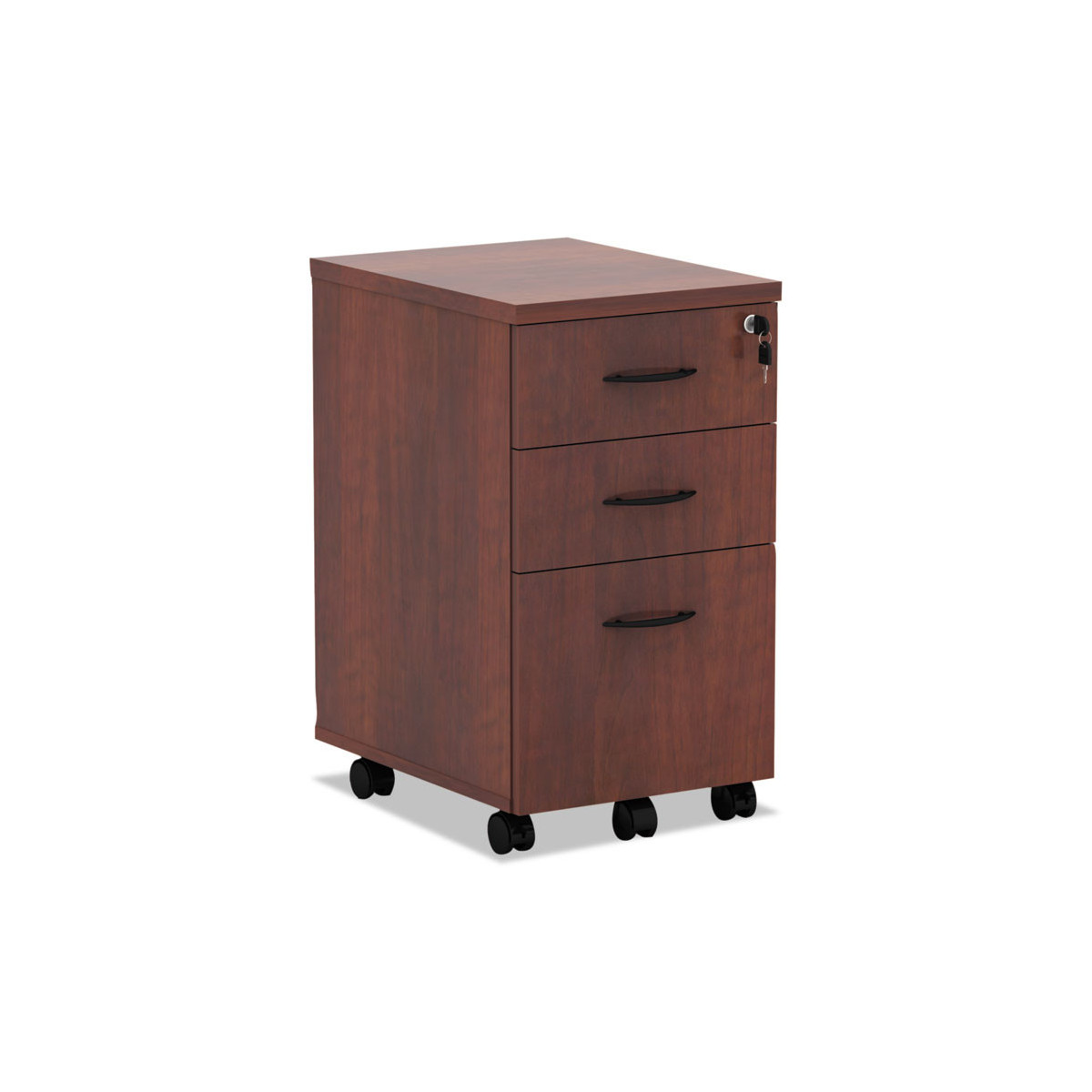 Mobile file cabinet is ready to go anywhere you need it to go. Full-extension ball bearing slides on file drawer for easy access to files. The drawers lock for securing contents. Durable 3 mm edge banding protects against bumps and dings. Five casters, two locking. Center caster prevents tipping. Fully assembled, just attach casters. Two, fold-away keys which provide a slimmer profile are included.