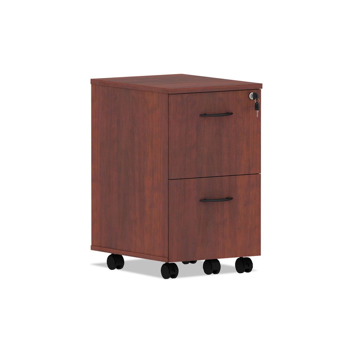 A contemporary classic file cabinet with clean lines and modern metal work. Thermally fused woodgrain laminate is scratch-, dent-, and water-resistant. The drawers operate on steel ball bearing, full-extension glides and accommodate letter/legal filing. Central locking safety keys fold-away for a slimmer profile. Easily mobile on five casters (two locking) and front center caster helps prevent tipping. Arrives fully assembled, just attach casters.