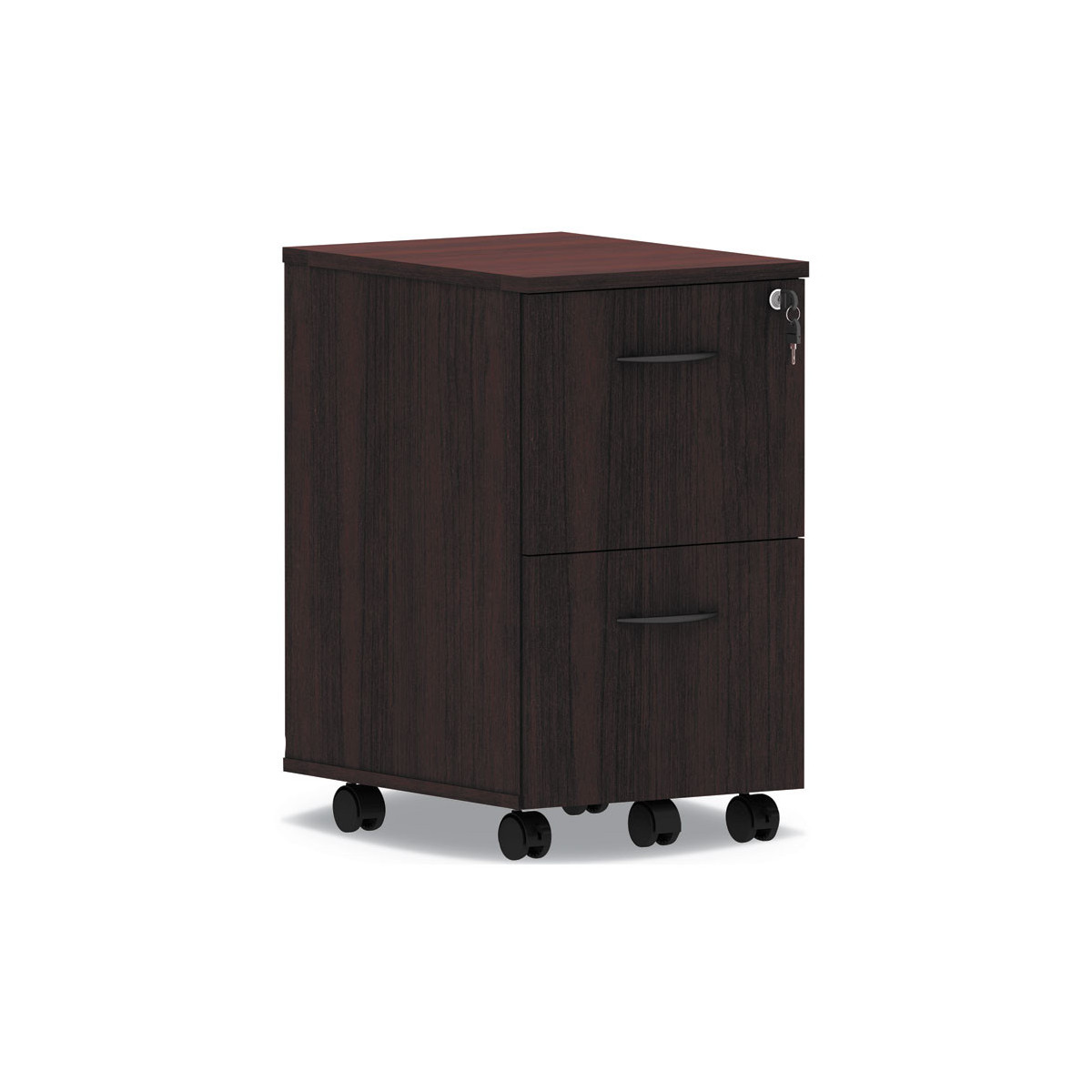 A contemporary classic file cabinet with clean lines and modern metal work. Thermally fused woodgrain laminate is scratch-, dent-, and water-resistant. The drawers operate on steel ball bearing, full-extension glides and accommodate letter/legal filing. Central locking safety keys fold-away for a slimmer profile. Easily mobile on five casters (two locking) and front center caster helps prevent tipping. Arrives fully assembled, just attach casters.