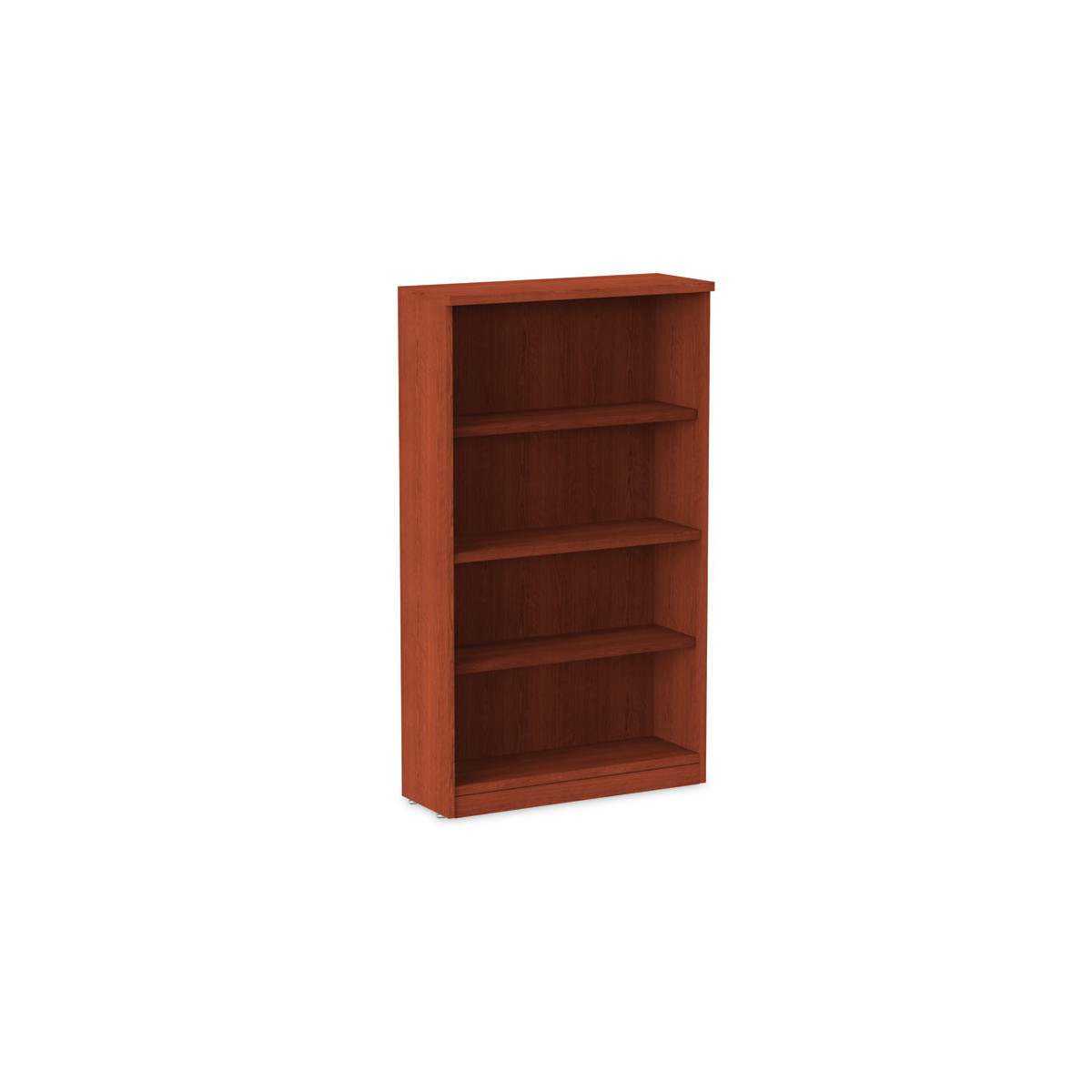 Woodgrain laminate bookcase features a contemporary design that fits perfectly in professional environments. Commercial-grade side panels with protective 3 mm edge banding provide excellent dent and scratch resistance. 11.75" deep shelves accommodate a wide range of materials. Top and bottom shelf are fixed, middle shelf is adjustable. Top panel is 14" deep for door installation. Tight, dowel, and cam-lock assembly provides a clean look while ensuring overall stability.