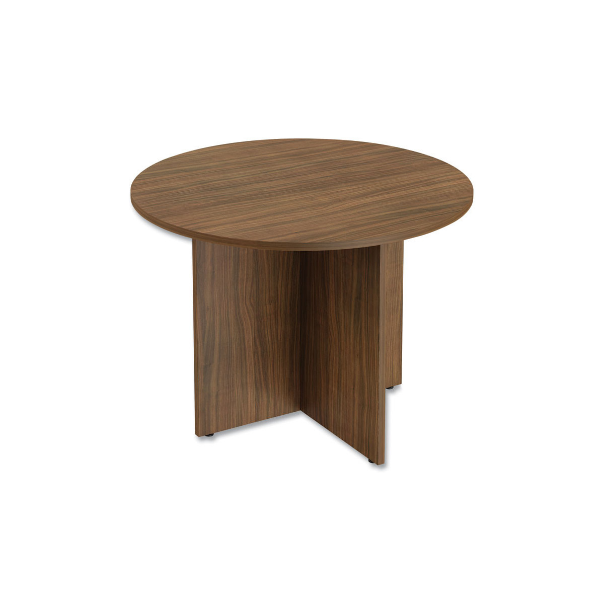 A popular table style adds extra work surfaces for quick-huddle setups or any conference room. Commercial-grade, 1" thick laminate top is water, scratch, and dent-resistant. The durable table features a protective 3 mm edge banding. The straight leg X-base takes up minimal space to maximize leg room and has leveling glides to help compensate for uneven floors. Matches Alera Valencia Series modular desking components.
