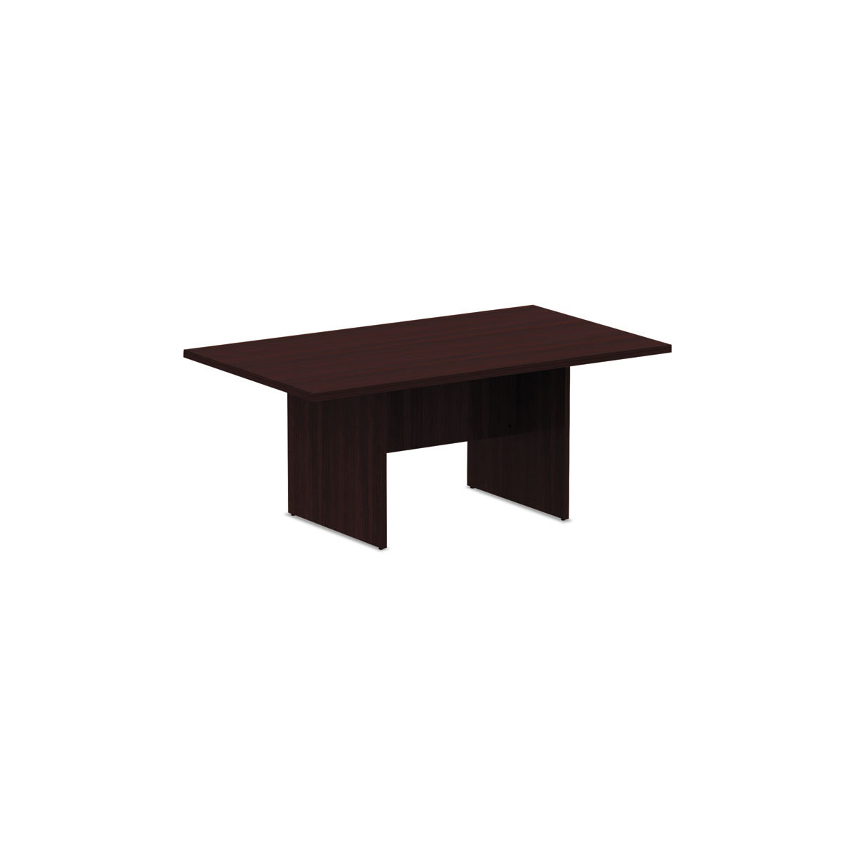 Classic rectangular conference tables work for meetings, breakrooms, or quick-huddles. Commercial-grade, 1.25" thick laminate top is water-, scratch-, and dent-resistant. Protective 3 mm edge banding helps prevent nicks. Modesty panel for privacy and stability. Leveling glides help compensate for uneven floors. Matches Alera Valencia desking components.
