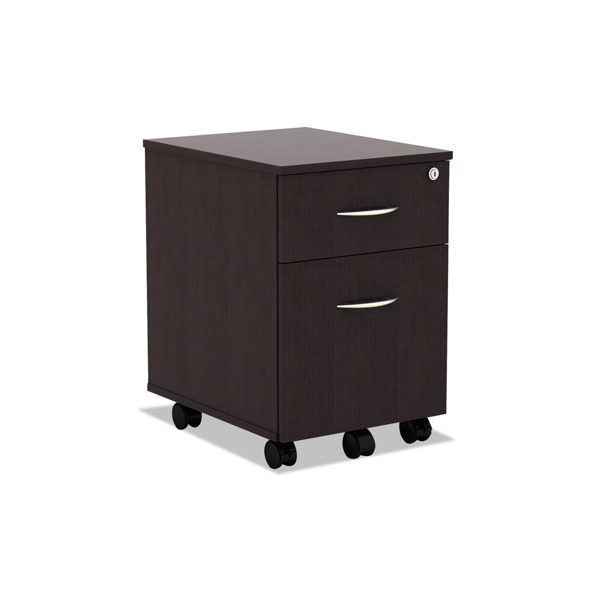 Sturdy woodgrain laminate mobile box file pedestal to store all your office necessities. Full-extension ball bearing slides on file drawer for easy access. Durable laminate is water-, scratch-, and dent-resistant with 3 mm protective edge banding. Two fold-away safety keys included. Accepts Alera® Pedestal Cushions for an instant seating option.