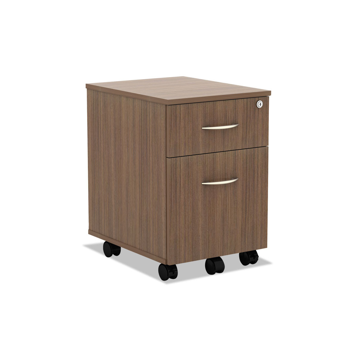 Sturdy woodgrain laminate mobile box file pedestal to store all your office necessities. Full-extension ball bearing slides on file drawer for easy access. Durable laminate is water-, scratch-, and dent-resistant with 3 mm protective edge banding. Two fold-away safety keys included. Accepts Alera® Pedestal Cushions for an instant seating option.