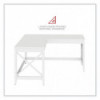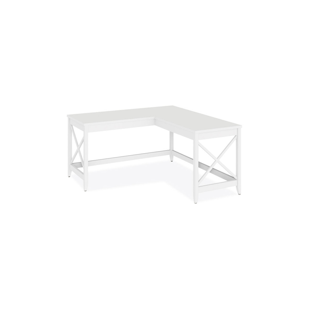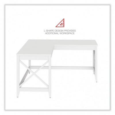 Stylish, L-shaped, farmhouse desk with X accents on side panels. The multi-function desk is constructed with a smooth, laminate wood top and white wood legs. The simple design without drawers fits conveniently into a corner to maximize space. Wide tabletop surfaces provide ample space to work and display organizational or decorative items. The open design has a light, airy feel, and coordinates with most décor. Some assembly is required.