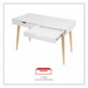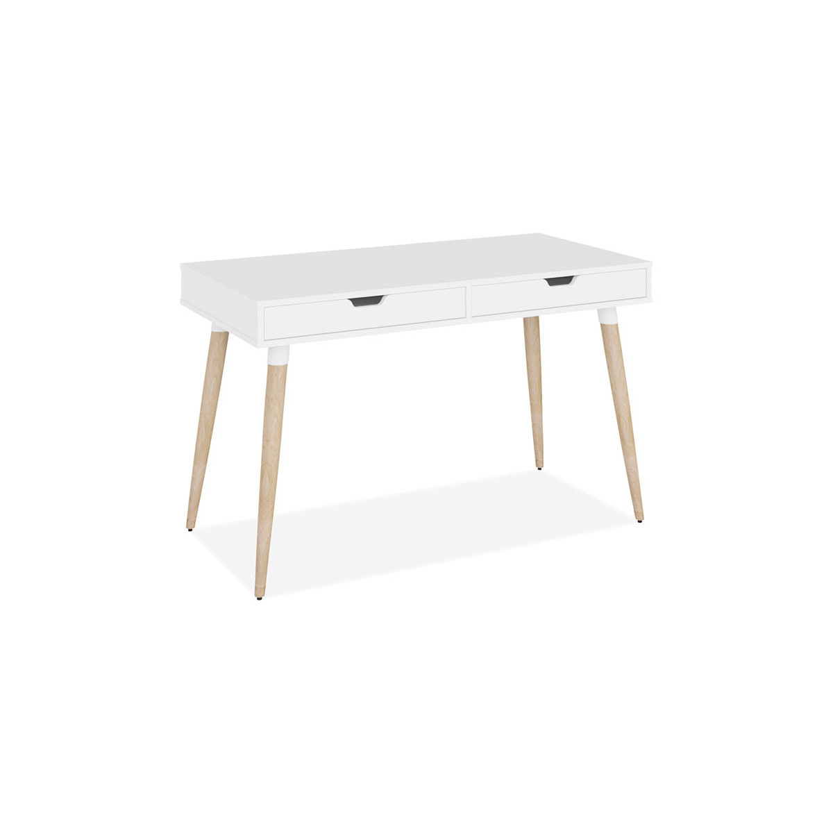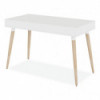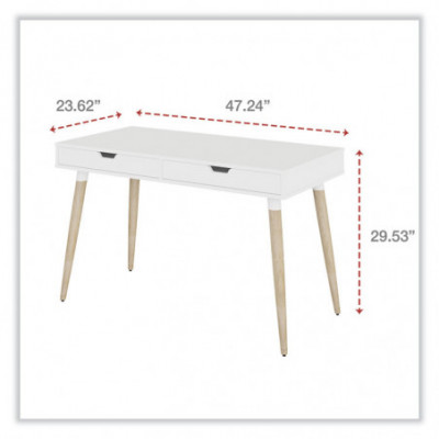 Scandinavian writing desk is a simple and modern working desk that's ideal for working or studying. The multi-function desk is constructed with a durable, white laminate top and beige wood-colored, angled, wood legs. The wide, smooth work surface allows you to manage multiple tasks at once such as working on a computer and taking notes. The desk includes two large, glided drawers which provide optimal storage. Designed with a clean look that takes up minimal space on the floor and fits the décor of most spaces. Some assembly is required.