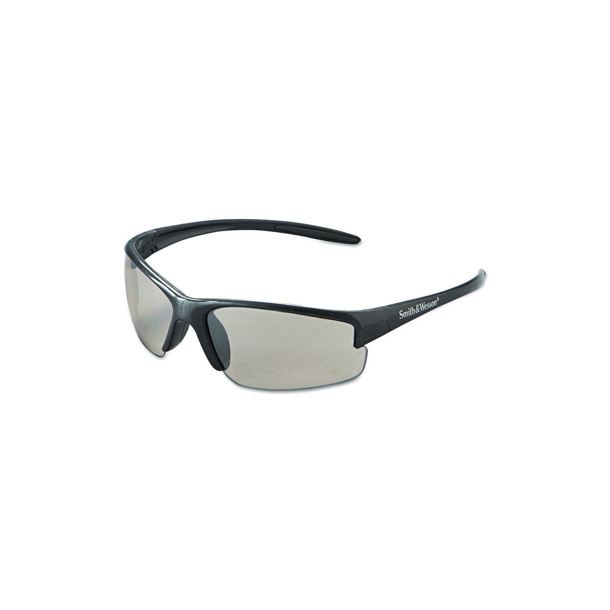 Stylish safety glasses have a modern, cutting edge design. Soft, rubber nose pads for superior comfort and fit. Dual lenses with an 8-base curve offer wraparound protection. Sport-grip temples eliminate slippage and help glasses sit comfortably. High performance polycarbonate lenses provide 99.9% UV protection. Safety eyewear meets ANSI Z87.1+ impact standard.
