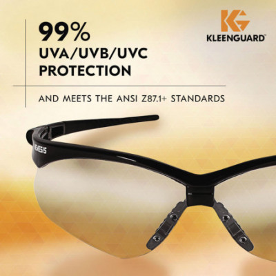 KleenGuard™ Personal Protective Equipment (PPE) enables rather than inhibits allowing for maximum productivity and safety for you and your employees. Giving your employees what they need to do their job safely and effectively is a top priority of any business owner. KleenGuard™ Nemesis Safety Eyewear's stylish good looks and durable, lightweight construction are just some of the reasons why millions of people wear them for protection both at work and at home. Nemesis Safety Glasses have KleenVision™ Anti-Fog coated polycarbonate lenses that provide 99.9% UVA/UVB/UVC protection to help prevent eye damage like cataracts, retinal damage, and other conditions that can cause temporary vision loss. The wraparound frame has a base curve of eight that extends the range of peripheral protection, as well as soft-touch temples for comfort. The Nemesis safety glasses have a patented nose piece designed to be extremely flexible, to channel sweat away from the eyes, and to help prevent slippage down the nose, all for long-term comfort. Each pair of KleenGuard™ Nemesis safety glasses come with a neck cord for securing them, so that the glasses are ready to protect at a moment's notice. Both men and women will find these stylish glasses to be comfortable and functional for construction, manufacturing, shooting range and a host of other industries. Remember: comfort and style drive compliance, so it pays to provide comfortable designer glasses that your staff will be proud to wear. Making the right Personal Protection choice is difficult. Perform with distinction with KleenGuard™ Personal Protective Equipment (PPE).