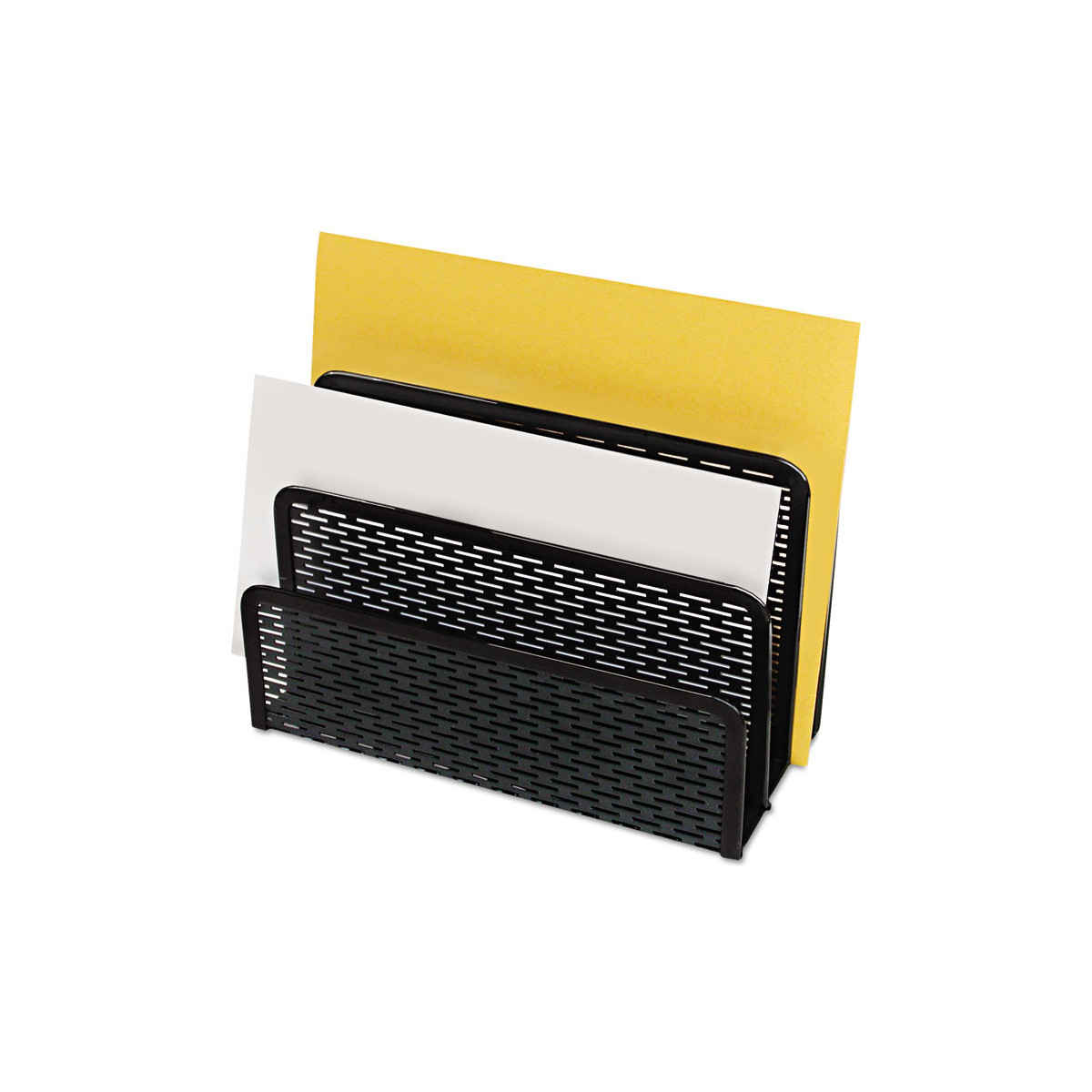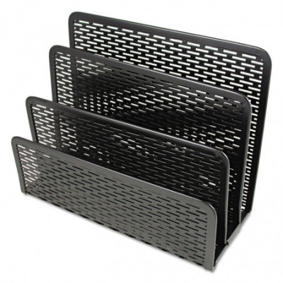Strong, professional grade punched metal with decorative urban style slotted pattern. High quality satin finish complements any décor. Features protective feet to prevent surface wear and scratches on the desktop surface. Reinforced rounded edges provide durability and attractive detailing. Provides three compartments to sort letters, memos, or other materials helping to organize your desktop and reduce clutter.